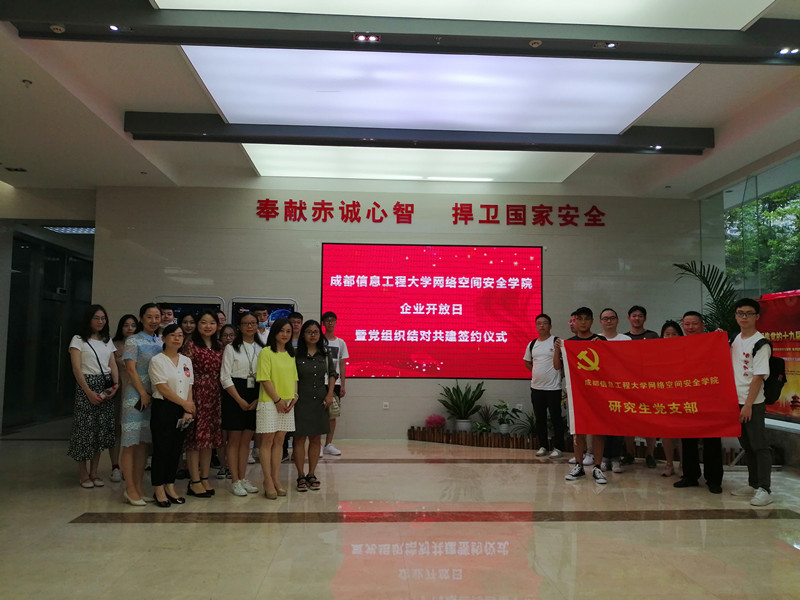 【本网讯】为深入学习贯彻党的十九大会议精神,探索在新时代下高校基层党建工作新思路、新模式,进一步推进“党建”和“科研”的深度融合,进一步推进“党建” “科研”和“人才招聘”的深度融合,以党建引领校企合作,2020年9月8日下午,网络空间安全学院研究生共60余人在学院党委副书记兼研究生辅导员林细俤和招生就业处副处长李雅静的带领下,赴成都卫士通信息产业股份有限公司(以下简称卫士通),开展“企业开放日”参观学习和校企党支部共建活动。