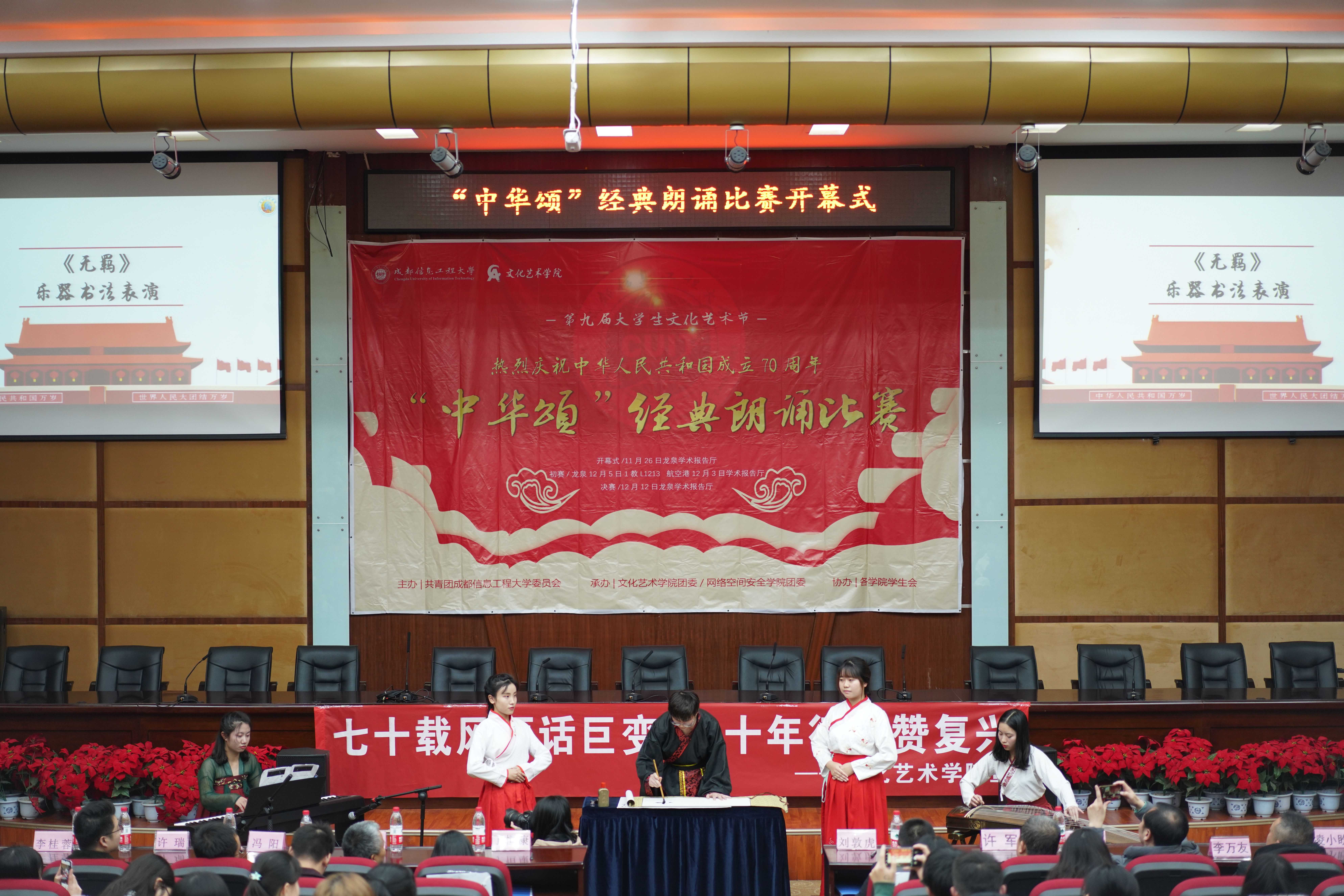 【本网讯】为深入学习贯彻党的十九大精神,落实“不忘初心、牢记使命”主题教育,弘扬中华优秀文化,激发同学们对祖国语言文字的热爱,提升同学们的语言文字应用能力,营造浓郁的校园文化氛围。11月26日,学校第九届大学生文化艺术节“中华颂”经典诗词朗诵在龙泉校区开幕。