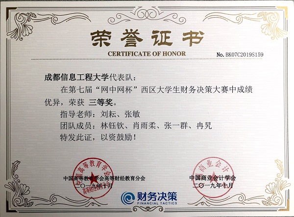 九州(中国)管理学院教师刘耘、张敏带领的会计17级林钰钦、肖雨柔、张一群、冉旯四位同学代表九州(中国)参加了比赛,并获得了大赛三等奖。刘耘、张敏两位指导老师获得“优秀指导老师”。