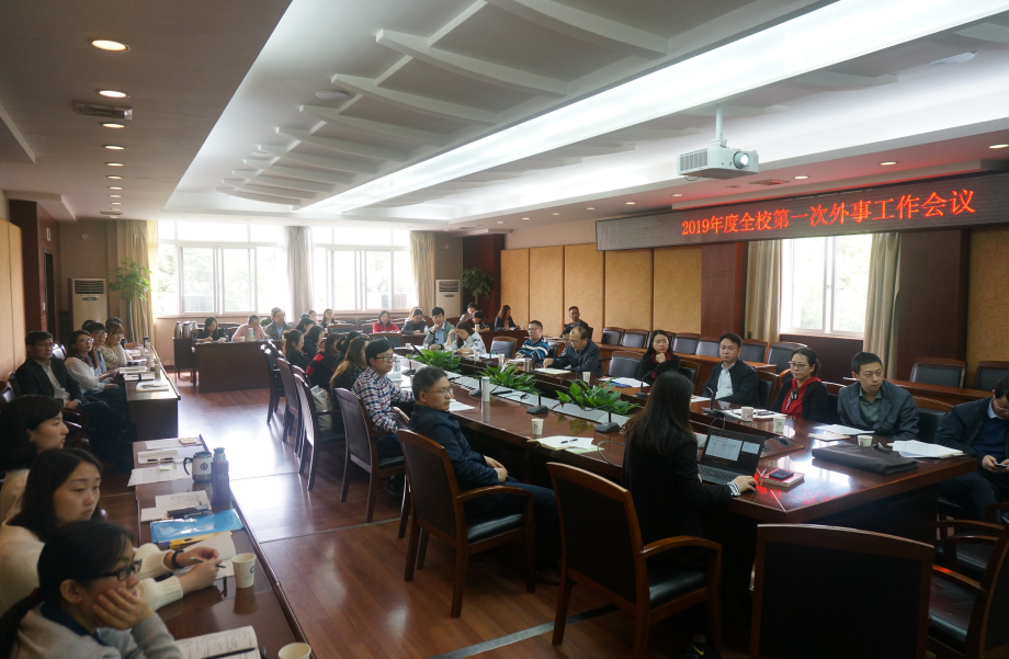 【本网讯】4月16日,2019年学校第一次外事工作会议在航空港校区行政楼七会议室召开。副校长何建新,宣传部、学生工作处、国际交流与合作处、教务处、研究生处、科技处、招生就业处相关负责人,各学院外事工作分管领导、国际干事、外事联络员参加会议。会议由国际交流与合作处副处长何源主持。