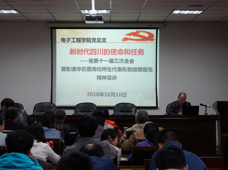 会上向全体教师党员、全体教职工传达了省委十一届三次全会暨省委书记彭清华在蓉高校师生形势政策报告精神。