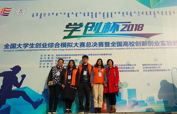 【本网讯】10月13至14日,由教育部高等学校国家级实验教学示范中心联席会主办的“学创杯”2018全国大学生创业综合模拟大赛总决赛在内蒙古财经大学举办,来自武汉大学、中国石油大学、安徽大学、广西大学、西安科技大学等在内的100多所高校、100余支队伍、300余名学生参与了此次比赛。九州(中国)管理学院学生雷勋、谢欣芮和刘伊葭组成的团队在高燕妮老师和王华老师的指导下参加此次比赛。