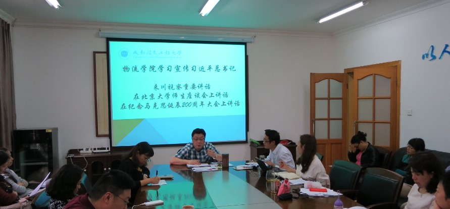 【本网讯】近日,物流学院党总支召开专题会议,学习宣传习近平总书记来川视察重要讲话、在北京大学师生座谈会上讲话、在纪念马克思诞辰200周年大会上讲话。会议由物流学院党总支书记龚晓林主持。