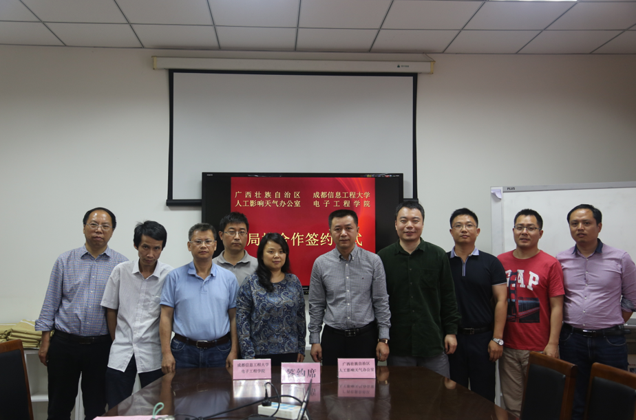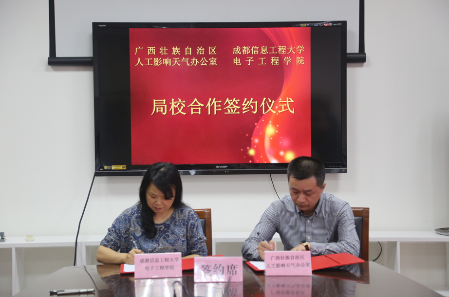 【本网讯】5月8日,电子工程学院与广西壮族自治区人工影响天气办公室局校合作签约仪式在气象楼216会议室举行。电子工程学院院长杨玲、广西壮族自治区人工影响天气办公室主任曹江平参加签字仪式并讲话。仪式由学校科技处副处长汤志亚主持。