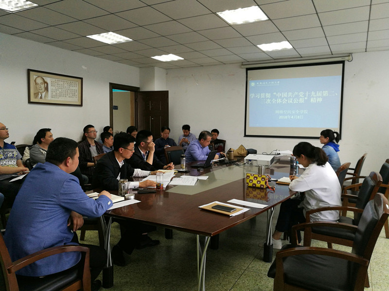 【本网讯】4月8日下午,网络空间安全学院召开全体教职工会议,集中学习党的十九届二中、三中全会精神和四川省十一届二次全会精神,并对学院2018年重点工作和新学期主要工作进行了部署。专题学习会由学院党总支书记陈麟主持。