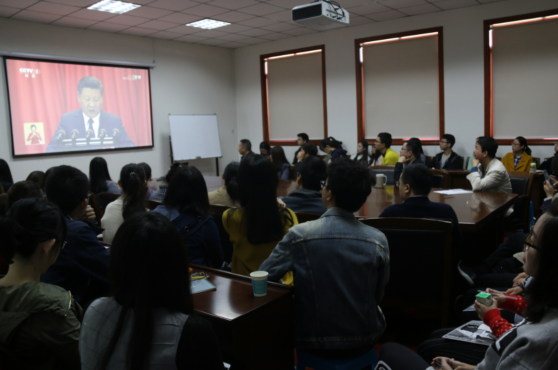 【本网讯】10月18日上午9点,大气科学学院组织学院师生在气象楼310会议室实时观看了十九大直播,学院全体行政人员、部分专职教师以及本科生、研究生、学生干部、学生党员代表等认真聆听了习近平总书记的报告。
