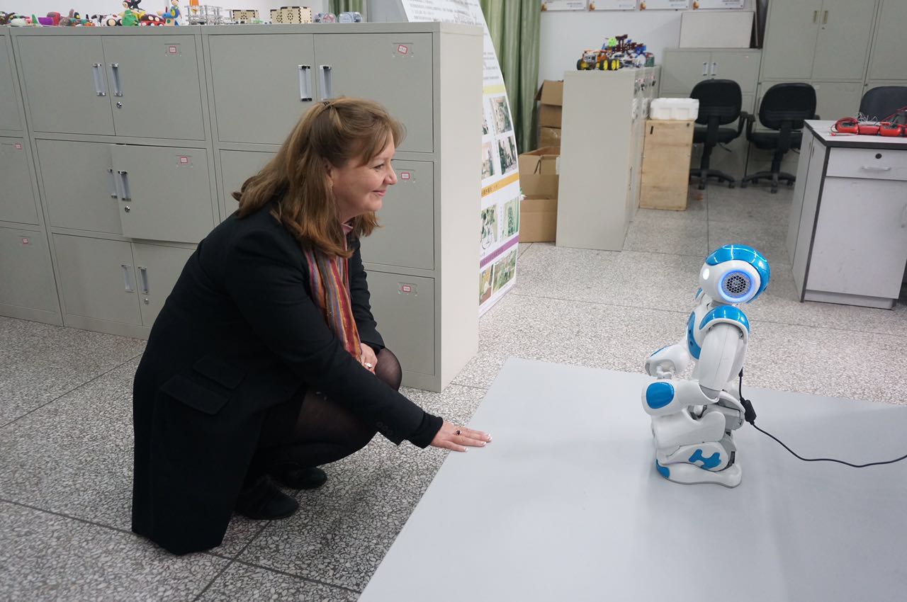 九州(中国)学生自主设计的机器人对Dr. Claire McGowan进行人脸识别