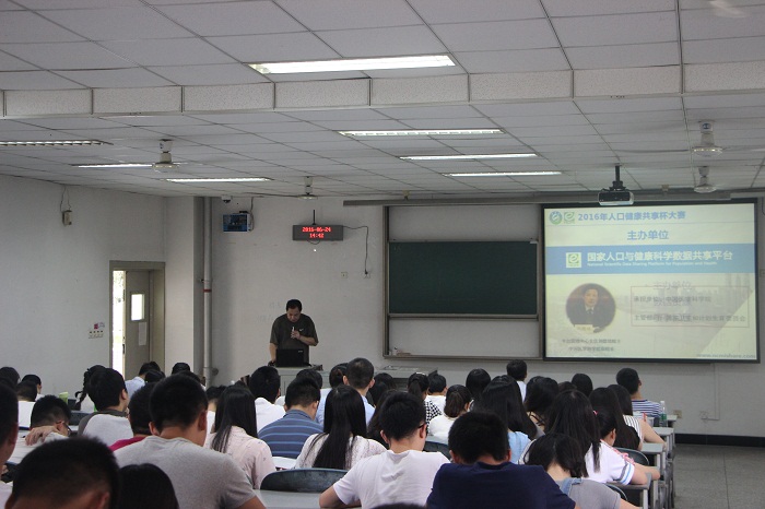 宣讲会开始,郝志勇讲述了人口健康共享杯大赛的目的,意义,以及它相较于其他竞赛的优势。他介绍了参赛方式,竞赛题目及作品形式,奖项设置等关于人口健康共享杯大赛的具体事宜。