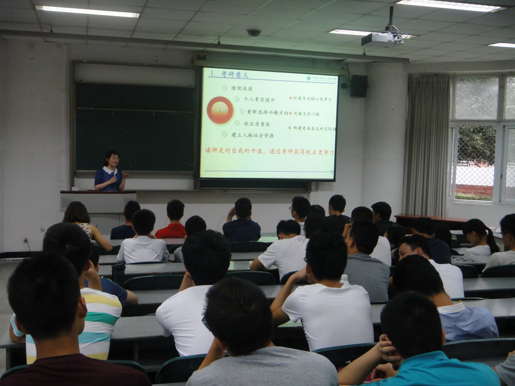 会上,邓丽琴鼓励同学们继续深造不断提升自己,结合自身情况明确目标做好未来规划。沈艳从个人素质提升及社会竞争力等方面谈了考研的好处及重要性,分析了2015年考研形势,并且解读了本校研招政策,同时从学院教研平台、师资力量、研究生招生专业等方面对学院进行了整体介绍。三位考研同学代表就自身的考研动机、专业选择、复习考试经验等和大家进行了交流分享。同学们也对所关心的问题进行了积极踊跃的提问。