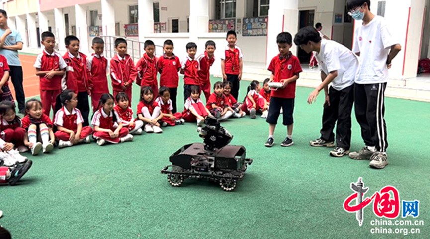 该校大学生们通过实物,向小朋友们详细讲解了步兵机器人的设计、制造流程以及涉及的各类物理知识点,并通过现场展示,让孩子们亲自操控让机器人完成各种任务,满足了孩子的好奇心与探索欲,激发和培养青少年从小爱科学、学科学、用科学的意识和兴趣。据悉,这也是该校自动化学院的师生们今年第二次来到泸定县中小学开展科普活动。