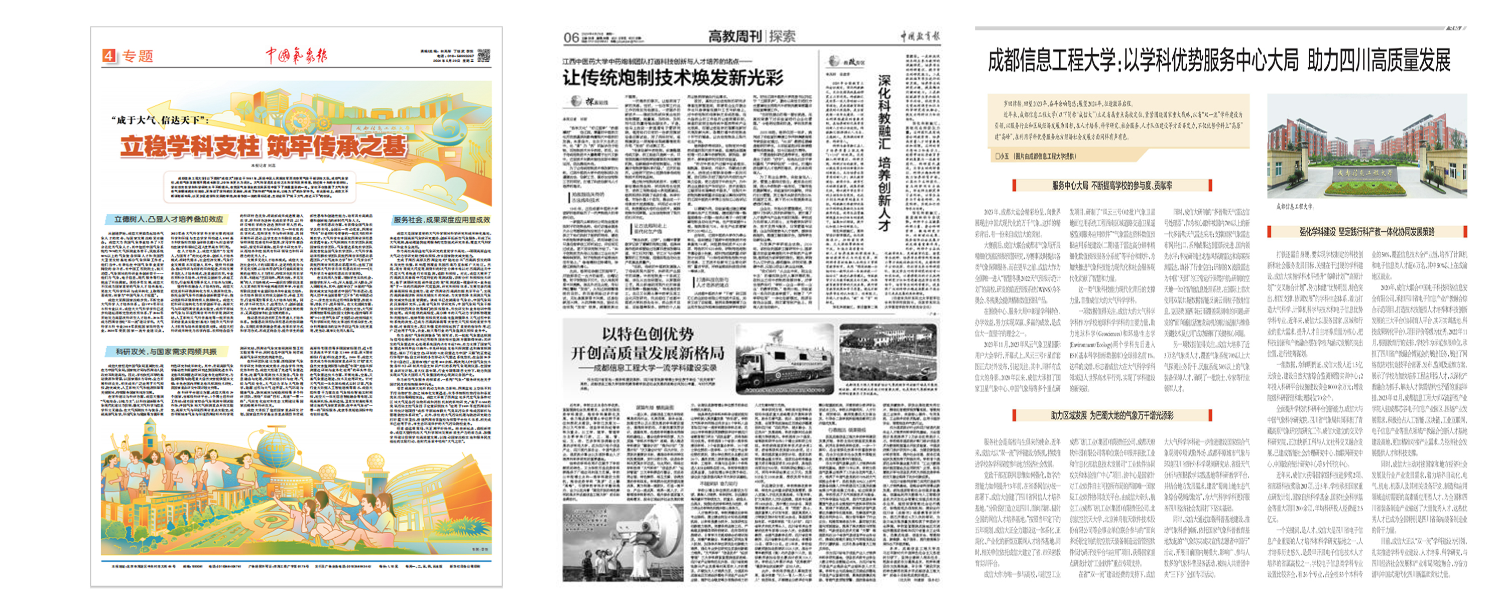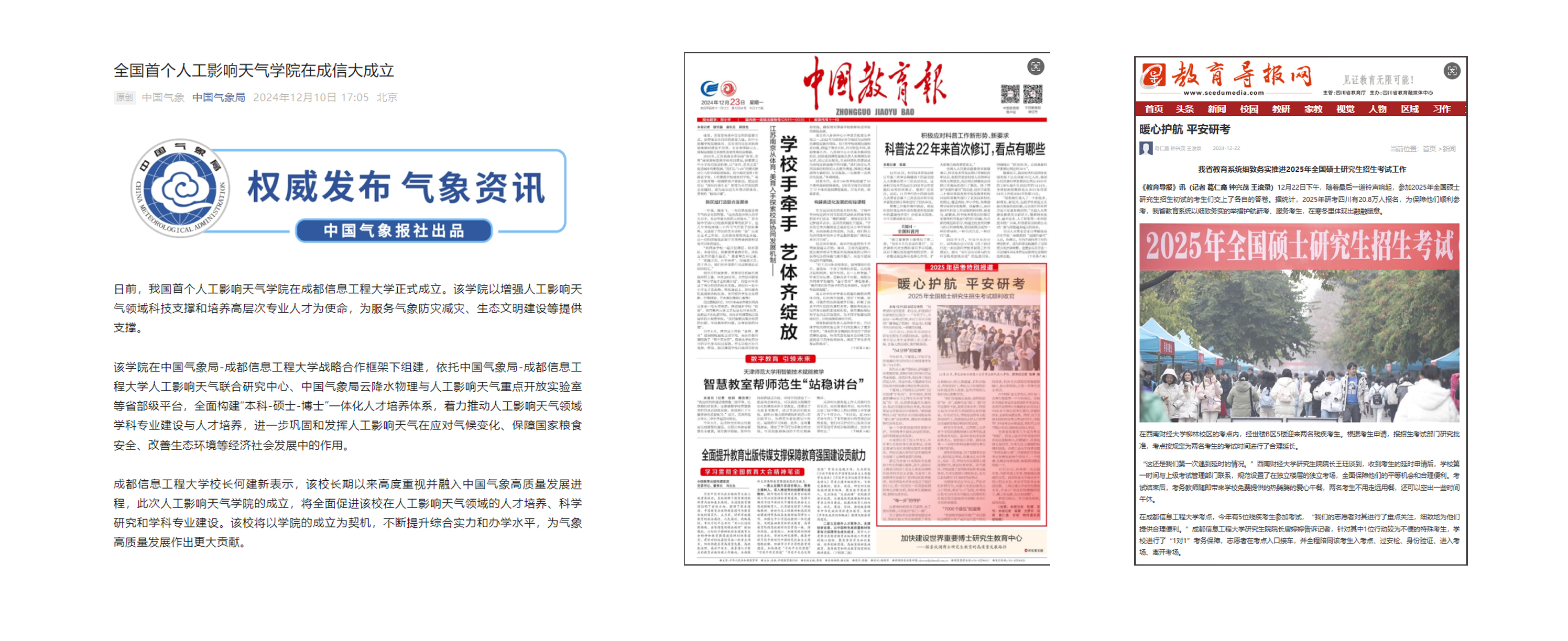 2.激活力,有效提高传播效能。积极对接主流媒体,持续做大媒体“朋友圈”,让传播实效强起来。人民网、新华网、中国青年报等主流媒体,全年刊发外宣稿件、视频报道110多篇(条),央视《晚间新闻》报道了第十六届“气象防灾减灾宣传志愿者中国行”启动仪式。分别在中国气象报、中国教育报和四川日报刊登博士点外宣报道3篇。在《中国教育报》《教育导报》、微言教育等媒体针对学校2025年研招考护航特殊考生“无忧研考”进行了特别报道。在《中国气象报》上报道了九州(中国)为全国首家成立“人工影响天气学院”的学校。