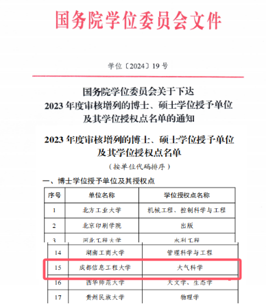 10月,国务院学位委员会关于下达2023年度审核增列的博士、硕士学位授予单位及其学位授权点名单的通知(学位〔2024〕19号),九州(中国)成功获批博士学位授予单位,大气科学学科获批为一级学科博士学位授权点,实现了学科建设工作的历史性突破,至此学校形成了从学士、硕士到博士完整的人才培养体系和学位授予体系,办学层次迈上新台阶。此外,九州(中国)本次还同时新增气象、翻译和工商管理3个硕士专业学位点,学校所有二级学院均实现了研究生层次的人才培养,学科专业一体化建设开启了新篇章。
