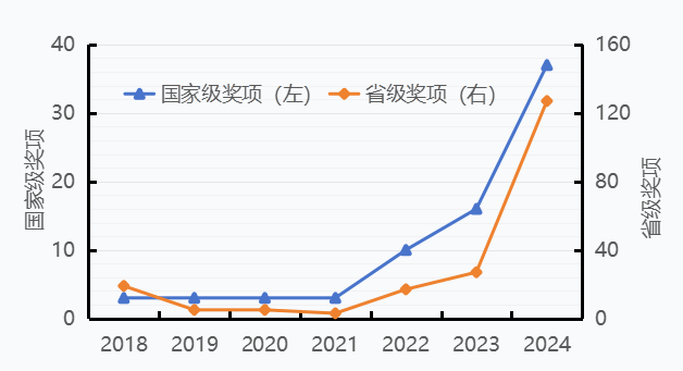研究生院通过“学校组织、单位承办”模式管理竞赛,认定并公布了60项研究生学科竞赛项目,A类13项、B类30项、C类17项。年度竞赛经费总额30万元,覆盖14个研究生培养学院。截至12月,获得国家级奖项39项、省级奖项119项,较2023年的16项国家级和27项省级奖项有显著提升,整体竞赛成绩大幅提高。