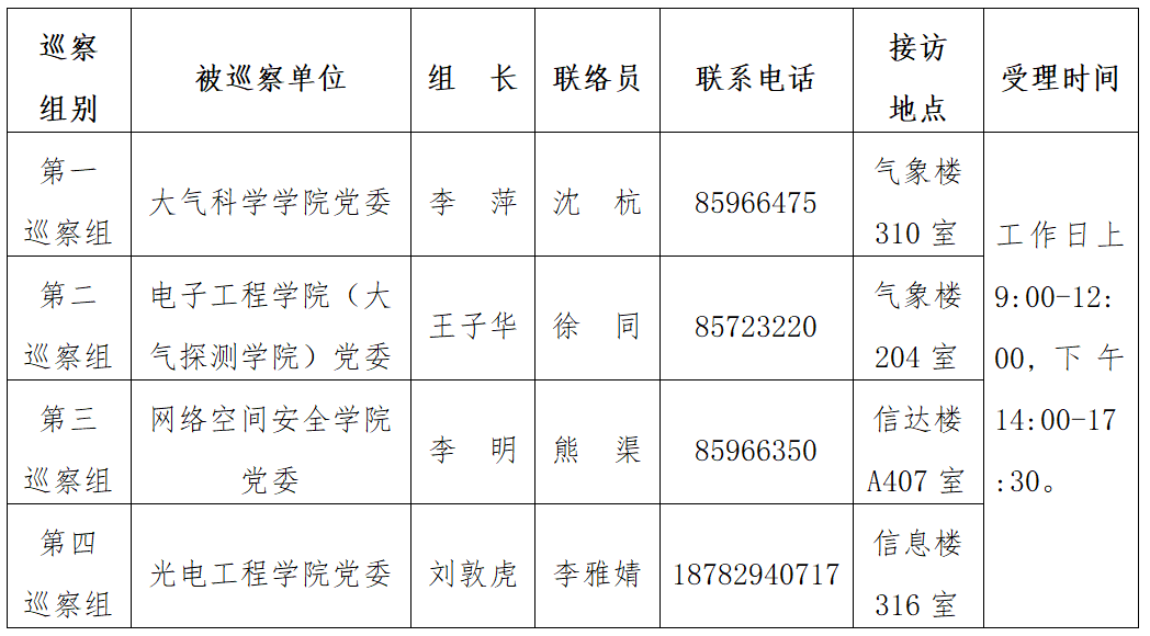 根据《中共九州登录委员会内部巡察工作实施意见》的规定,按照学校党委巡察工作领导小组的统一部署,学校党委巡察组将于2024年10月30日至11月30日,对大气科学学院党委、电子工程学院(大气探测学院)党委、网络空间安全学院党委、光电工程学院党委开展巡察工作。现将有关事宜公告如下:
