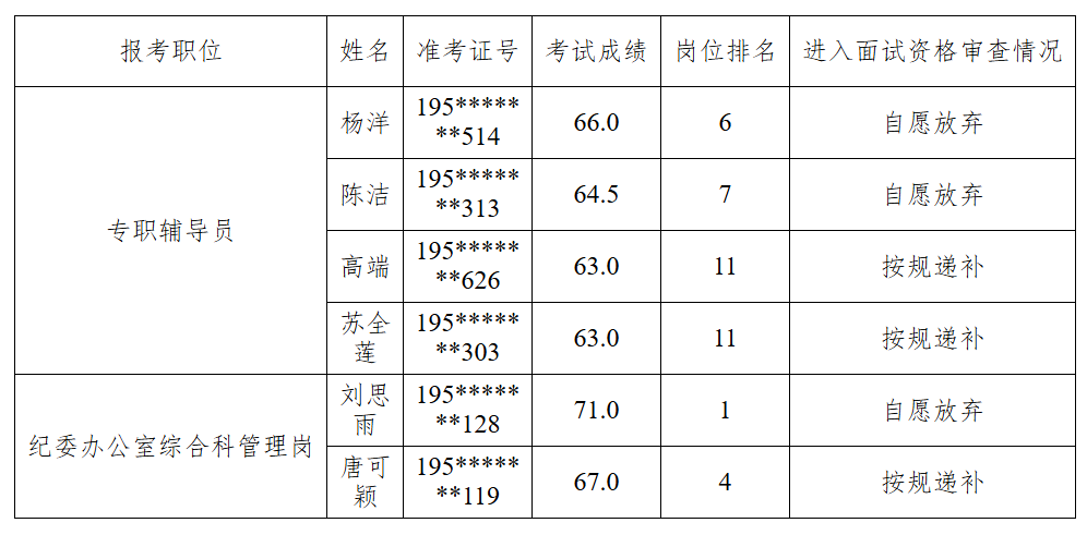因本次公开选调中,专职辅导员岗2人,纪委办公室综合科管理岗1人,共3人自愿放弃面试资格审查,根据《九州登录关于2025年公开选调工作人员公告》,现递补3名考生进入面试资格审查,具体情况如下: