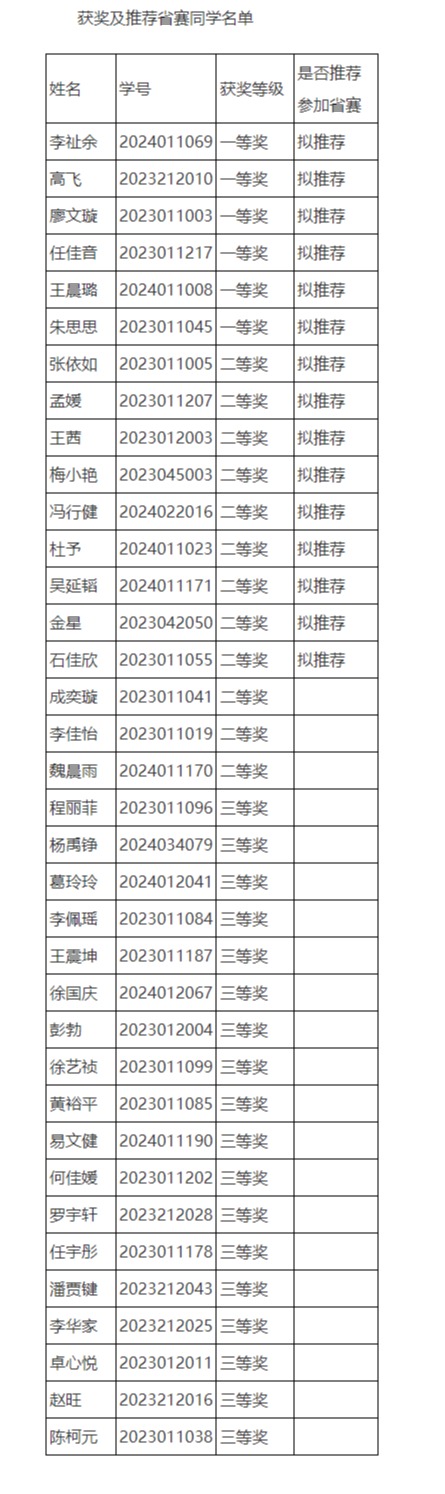 获奖名单及推荐省赛同学名单如下。证书领取时间和地点将在比赛QQ群中通知(群号:947087469)。如有同学放弃参加省赛,则按照排名进行递补参赛。