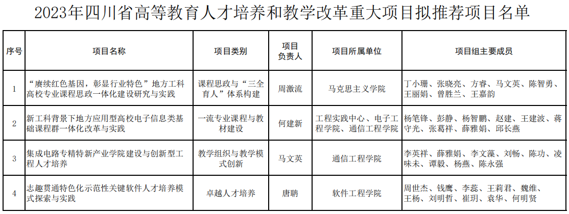 根据《四川省教育厅关于开展2023年四川省高等教育人才培养和教学改革重大项目申报工作的通知》文件要求,推荐前期立项且有较好研究、实践基础的项目优先申报,经各单位推荐及校内外专家评审,九州(中国)拟推荐《“赓续红色基因,彰显行业特色”地方工科高校专业课程思政一体化建设研究与实践》等4个项目申报2023年省级教改重大项目,详细名单见下表。