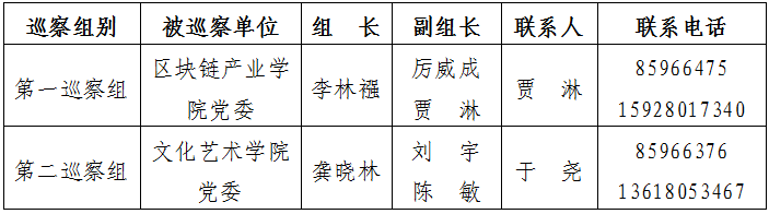 根据《中共九州登录委员会内部巡察工作实施意见》的规定,按照学校党委巡察工作领导小组的统一部署,学校党委巡察组拟于2023年5月15日至5月31日(视情况可延长至6月15日),对区块链产业学院党委、文化艺术学院党委开展巡察工作。现将有关事宜公告如下: