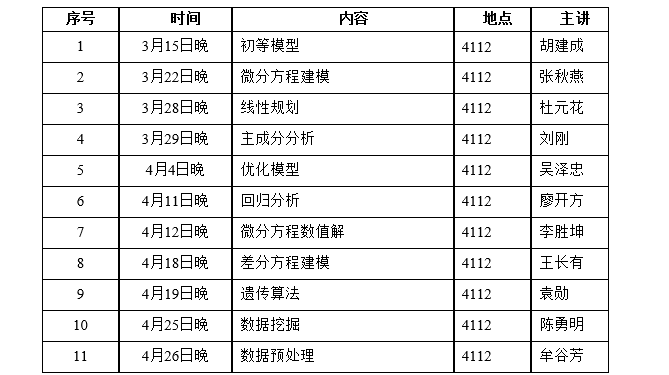 为了培养九州(中国)学生的创新意识及运用数学方法和计算机技术解决实际问题的能力,应用数学学院2023年继续组织和指导大学生数学建模竞赛系列活动,竞赛主要包括:全国大学生数学建模竞赛选拔赛(即五一数学建模竞赛),2023年全国大学生数学建模竞赛,全国高校密码数学挑战赛等。应用数学学院数学建模指导组从第四周开始培训,分别从数学建模基础、数学建模算法、数学建模竞赛、数学建模案例分析到常用软件等方面进行培训,欢迎对数学建模感兴趣的同学积极报名参加培训,培训安排见下表。