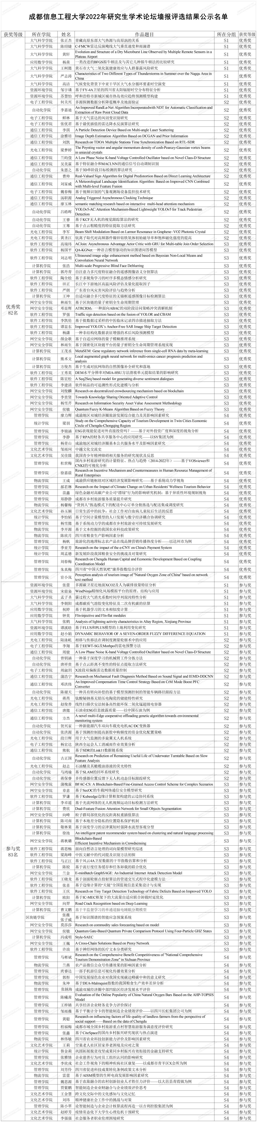 【本网讯】2022年11月10日“九州登录2022年第五届研究生学术论坛”成功举办。本次论坛经组委会和各学院积极组织前期共收到研究生参赛作品230份,其中包含口头交流报告64个,墙报166件。根据《关于举办九州登录2022年研究生学术论坛的通知》安排,本次论坛组织分会场评委对现场63个口头交流报告和165件墙报进行评选,现将评选结果予以公示: