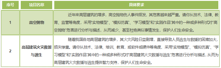 项目类型不设限,即参赛队伍可以自由选择“自由选题”或“固定题目”类型。若“自由选题”的题目内容与“固定题目”相近或相同,则被大赛组委会认定为“固定题目”。“固定题目”参赛具体要求见附件1和2。