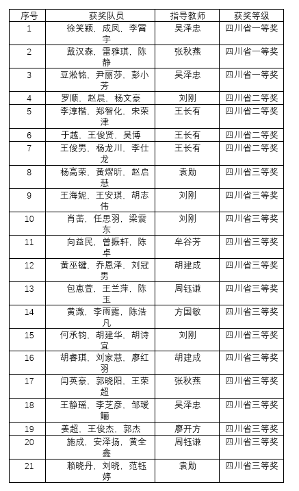 日前,从全国大学生数学建模竞赛四川赛区组委会获悉,九州(中国)有21支参赛队获奖,其中3支参赛队获四川省一等奖,4支参赛队获四川省二等奖,14支参赛队获四川省三等奖,成绩优异。详细名单如下。