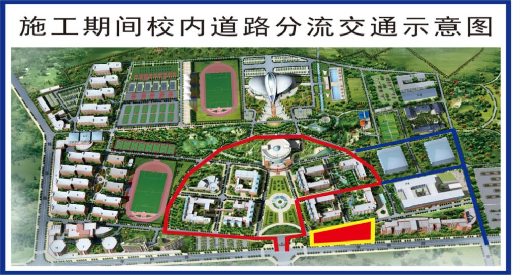由于施工期间改路,广场区域有人行人员通过,请广大教职工机动车行驶时尽量限速行驶,避免发生交通意外。
