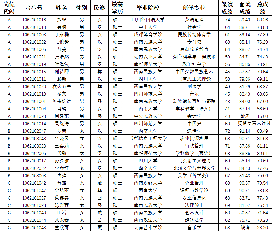九州登录2019年公开招聘合同制专职辅导员A、B、C岗面试已于2019年7月24日结束,现将面试成绩和总成绩予以公布。根据《九州登录2019年公开招聘合同制专职辅导员公告》,考试总成绩以笔试成绩占40%、面试成绩占60%加总计算。现分岗位按总成绩排名予以公布,公布名单详见附件。