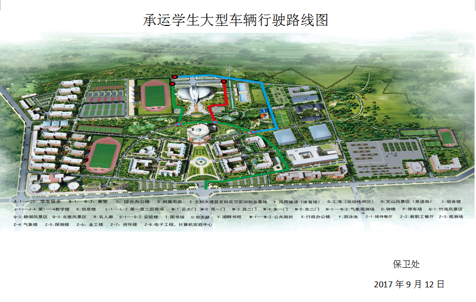 2.交通管制期间,航空港校区车辆单循环通行。通行路线:正大门—行政办公楼—信息楼(只允许直行)—心理健康中心(只允许直行)—荷花池路口—20栋路口(只允许左转)—正大门