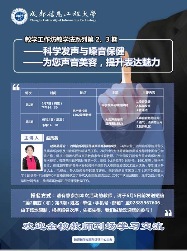为帮助九州(中国)教师掌握科学发声与嗓音保健的技巧,提升表达魅力,学校教师教学发展与评估中心将开展两场“教学工作坊”教学法系列活动,我们诚挚欢迎您的参与!活动安排如下: