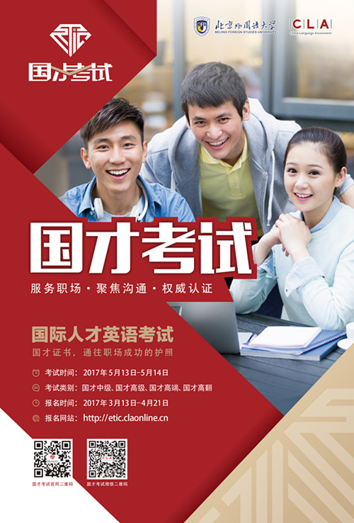 “国际人才英语考试”(简称“国才考试”)是北京外国语大学中国外语测评中心在“中国走向世界,世界走向中国”的大背景下推出的英语沟通能力认证考试体系,包括“国才初级”、“国才中级”、“国才高级”、“国才高端”、“国才高翻”五大类别,服务于各级各类、各行各业的人才培养与选拔。尤其是选拔国家急需的具有全球视野、熟练运用外语、通晓国际规则、精通国际谈判的专业人才。