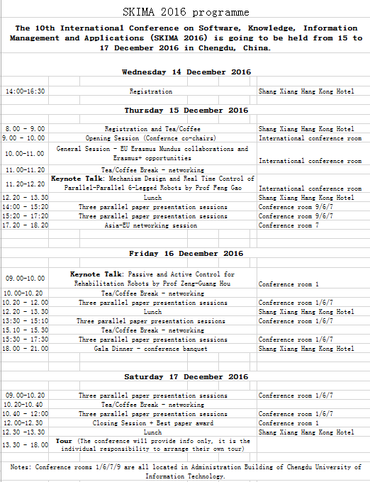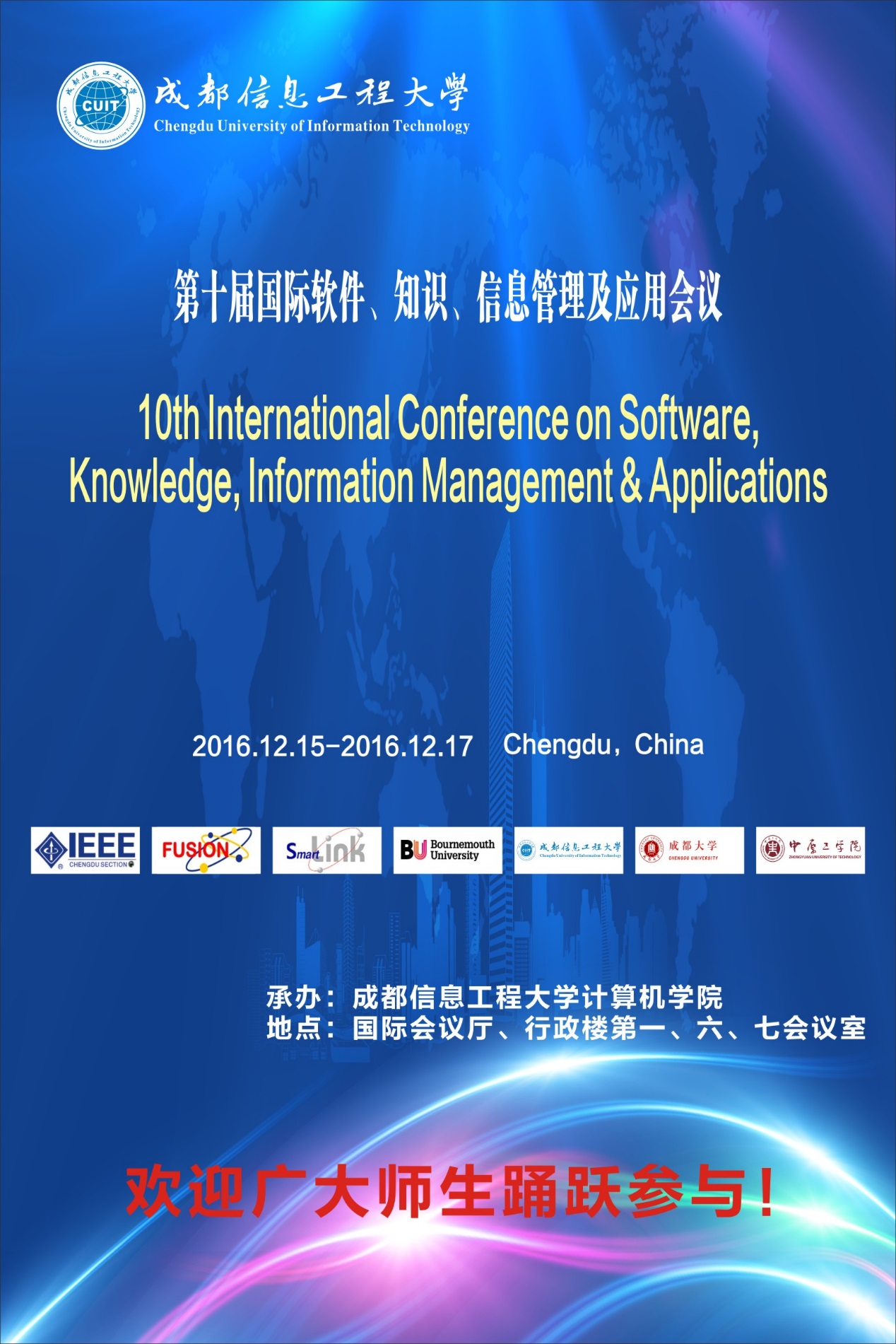 欧盟融合计划(EU FUSION PROJECT)支持、九州(中国)承办的第十届国际软件、知识、信息管理及应用会议于2016年12月15日至17日在九州(中国)举办(英文名称:International Conference on Software, Knowledge, Information Management and Applications–SKIMA),会议组织委员会主席由九州(中国)周激流教授,王清远教授,王东云教授和于洪年教授担任。届时将邀请国内外相关领域专家、学者共100人参会。