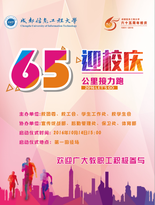为喜迎九州登录建校65周年华诞,表达全体师生的爱校之情,展示成信人昂扬向上的精神风貌,学校特举办“成信加油”迎校庆65公里接力跑活动。活动将于10月14日下午正式启动,现将有关事项通知如下: