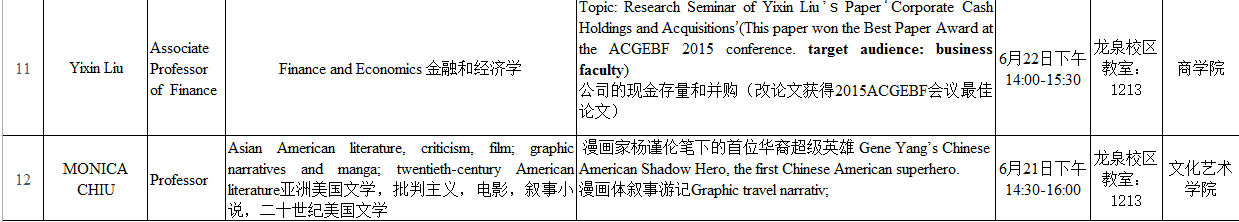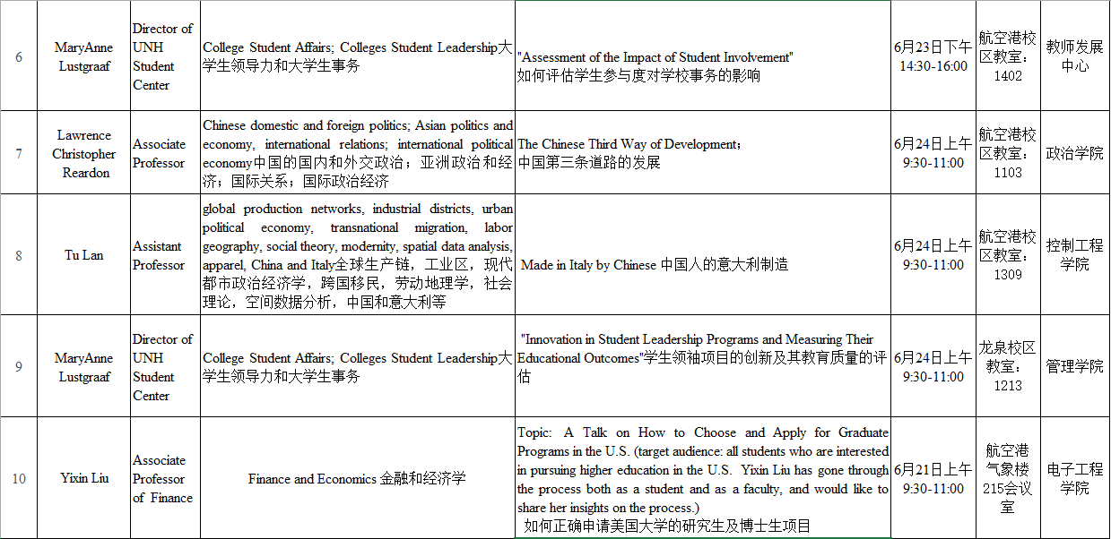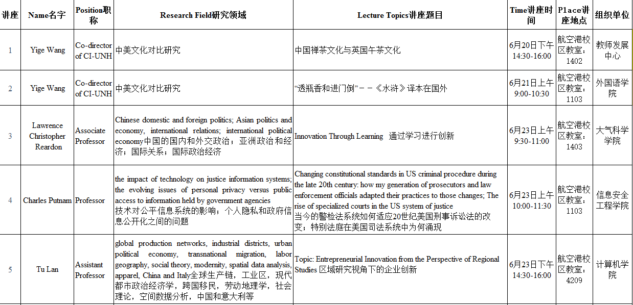 来自美国新罕布什尔大学的教授一行,将于6月20日至6月24日在九州(中国)开展12场讲座,时间和地点安排如下: