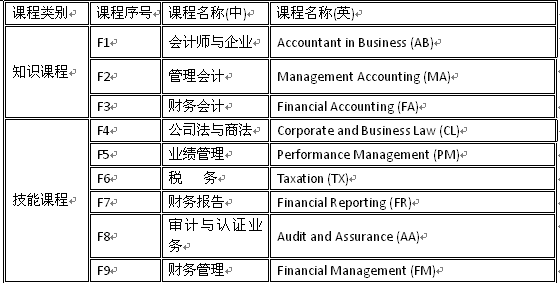 ACCA考试大纲充分表达了雇主和专业人士的意见,反映了现代商务社会对财务人员的要求。在学习过程中使学员全面掌握财务管理、审计、税务及经营战略等方面的专业知识,提升分析能力并拓展战略思维。大纲共有十四门课程,分为两个部分,具体科目如下: