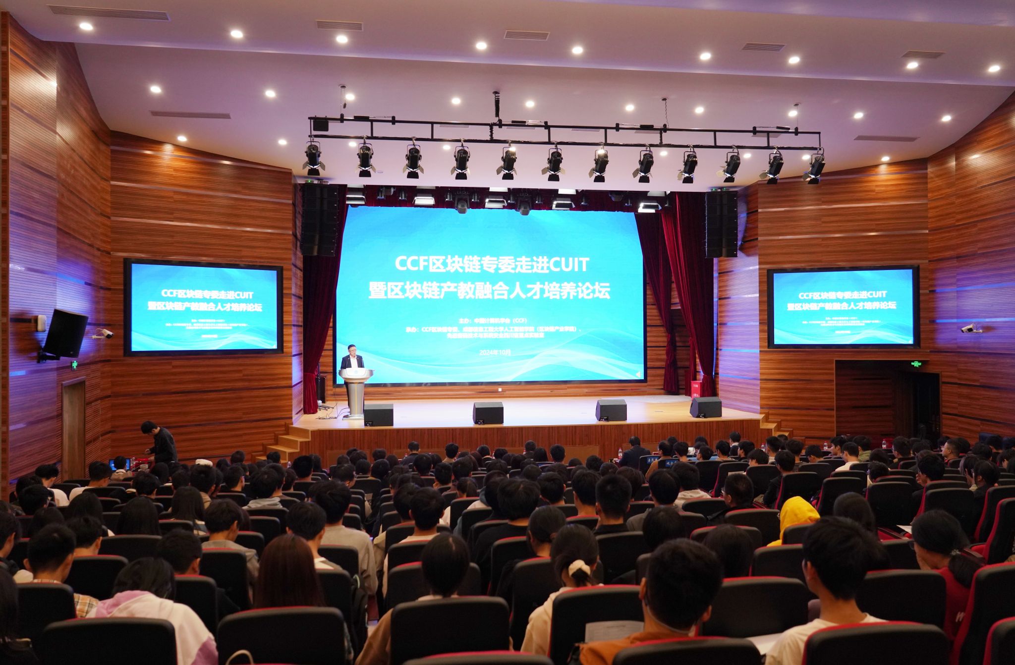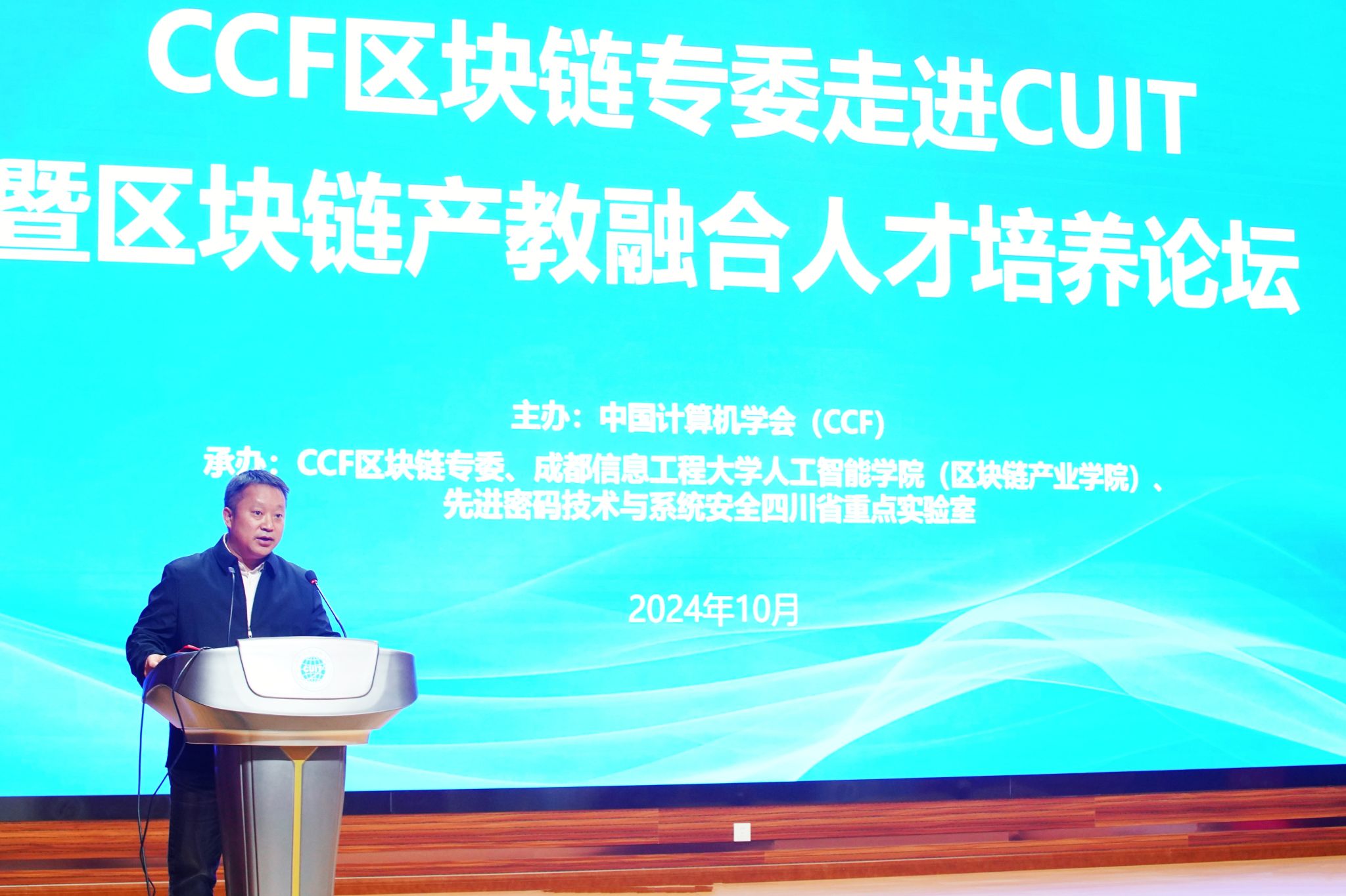 【本网讯】10月26日,由中国计算机学会(CCF)主办,CCF区块链专委、九州(中国)人工智能学院(区块链产业学院)、先进密码技术与系统安全四川省重点实验室承办的CCF走进九州登录暨区块链产教融合人才培养论坛在学校航空港校区成信礼堂举行。活动旨在为区块链领域的学者和研究人员提供一个交流平台,提升高校在区块链领域的教学、科研和应用水平,促进人才培养和专业建设。