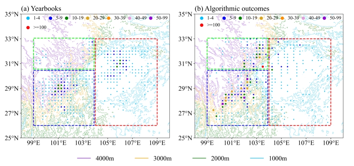 图1.年鉴中记录(a)和算法在ERA5 中识别(b)的西南涡空间分布(2012-2021年)。图中不同颜色的矩形虚线框表示三个不同的西南涡生成源地:红色代表四川盆地,蓝色代表九龙,绿色代表小金。图中不同颜色的圆点表示每个格点上西南涡的出现频次。等值线表示海拔高度(以米为单位)。