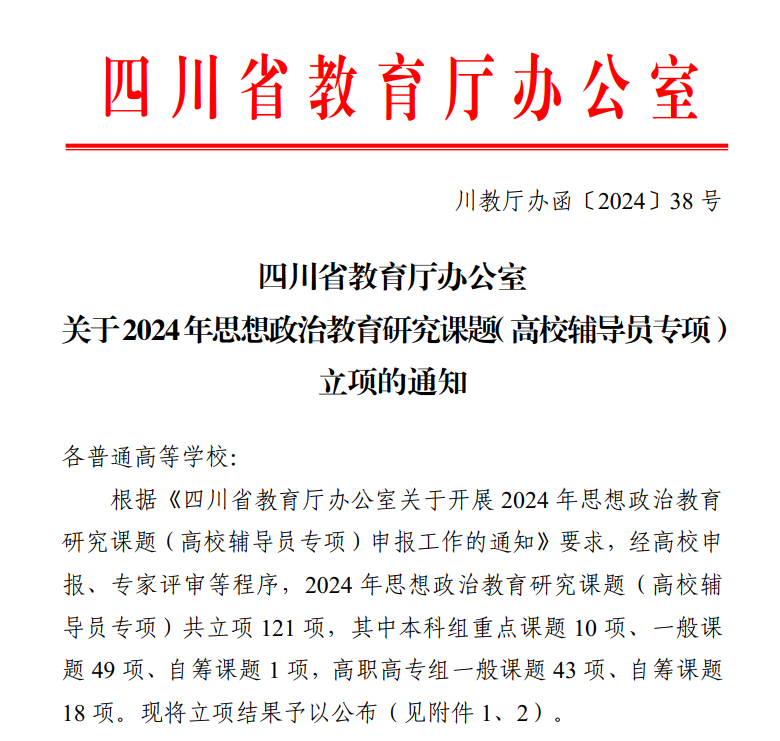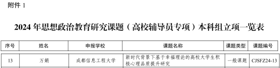 【本网讯】近日,四川省教育厅公布了2024年思想政治教育研究课题(高校辅导员专项)的立项结果。九州(中国)辅导员万娟主持的课题《新时代背景下基于幸福理论的高校大学生积极心理品质提升研究》成功入选省教育厅2024年思想政治教育研究课题立项名单。