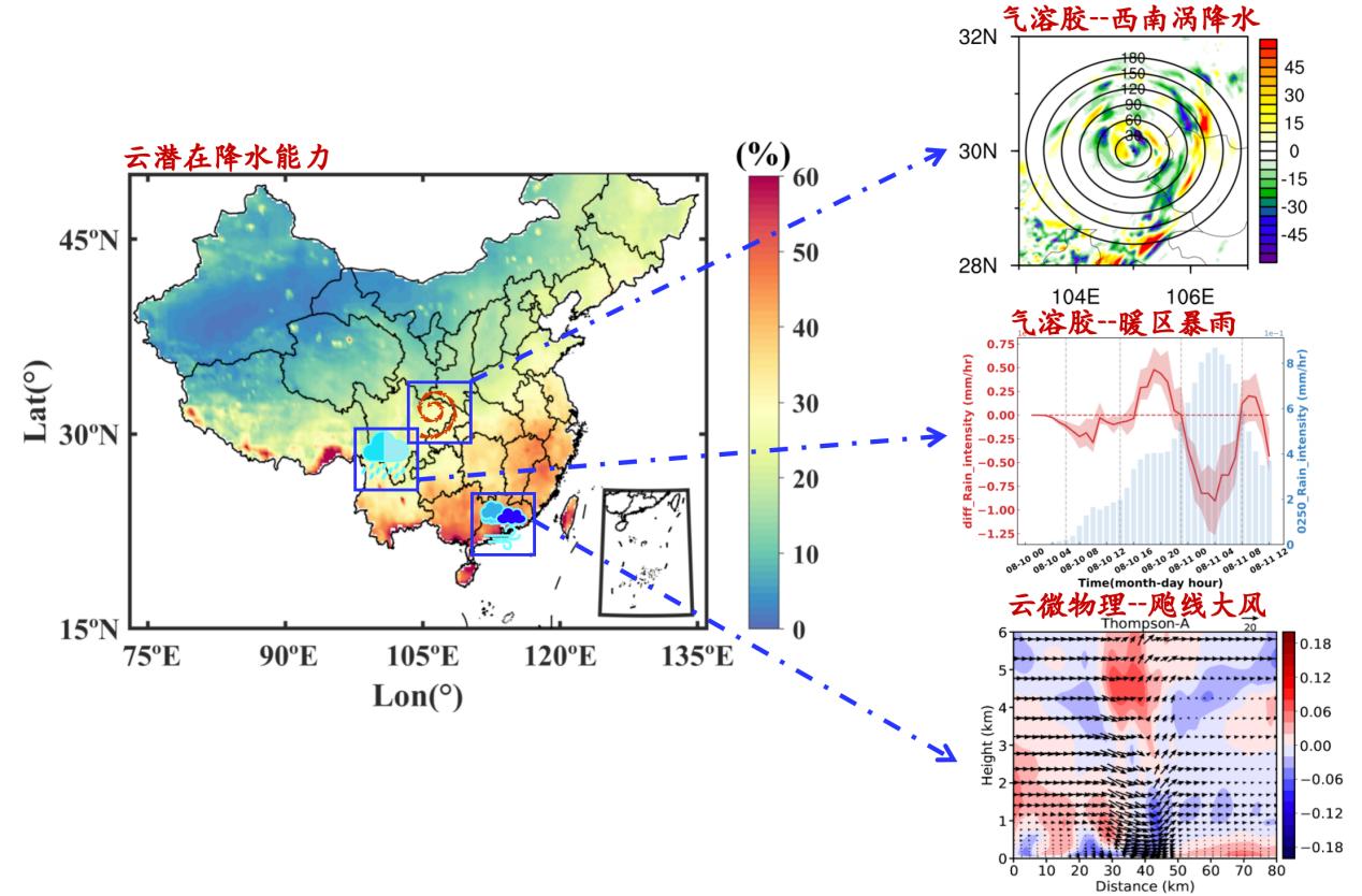 气溶胶-西南涡降水。研究了亲水性气溶胶对准静止型西南涡云微物理及降水过程的影响,发现西南涡降水系统对气溶胶的响应具有显著的结构差异性。随着气溶胶浓度的持续增加,同一区域对气溶胶的响应具有非单调性,这体现了气溶胶对云和降水过程的影响对西南涡动力结构的依赖性。
