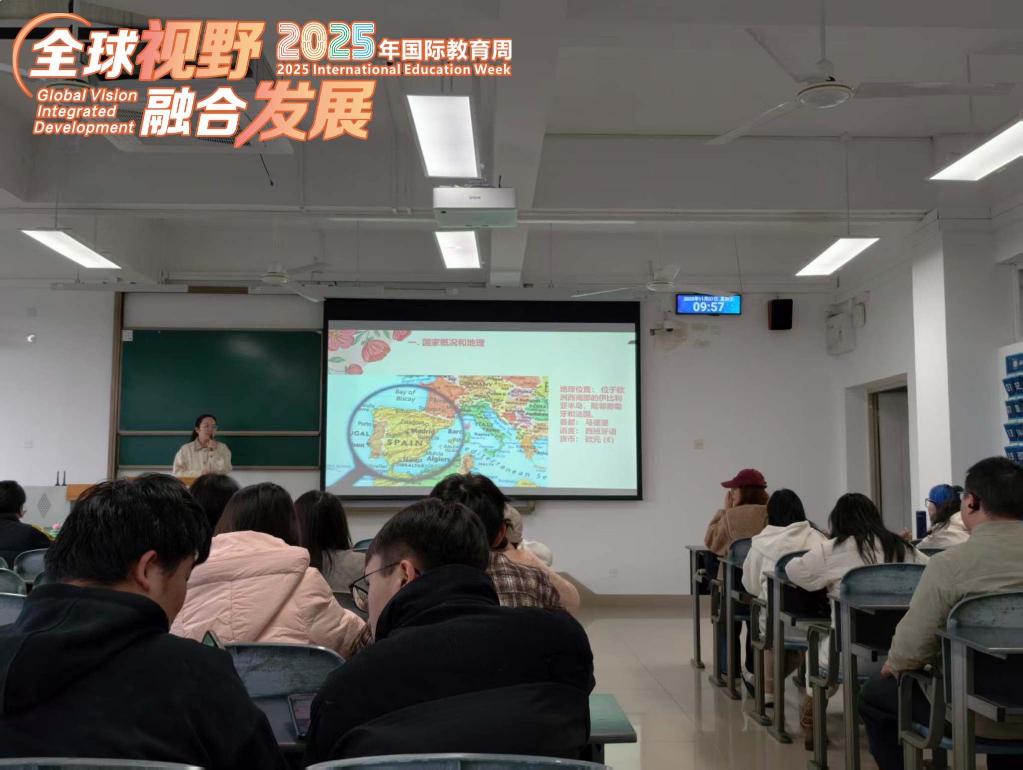 张蓝月老师为同学们详解了西班牙——这一欧洲文化艺术中心的魅力。内容涵盖其多元交融的国家概况、山海相拥的地理特色,以及马德里、巴塞罗那等名城的独特风情。她特别提到,西班牙语全球使用人口超5亿,应用广泛,也是联合国官方用语之一,学习好西语对于未来国际化的就业目标具有很大的优势。最后,她重点介绍了学校与马德里康普顿斯大学、巴塞罗那自治大学的交流项目,为同学们清晰规划了欧洲留学的路径。