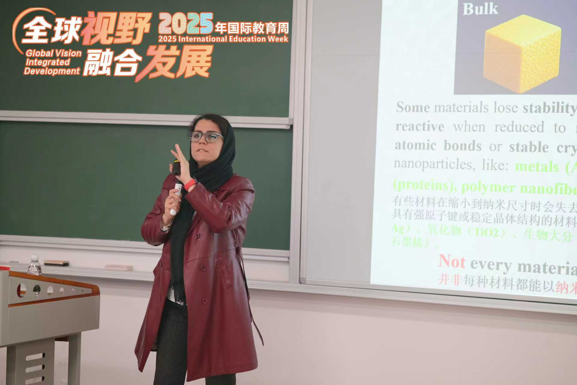 Marjan教授从纳米概念的起源讲起,系统回顾了纳米科学的发展历程,生动阐释了纳米材料因小尺寸、大比表面积和量子效应而产生的独特性能。她通过靶向药物输送、高效太阳能电池、智能运动装备等众多前沿案例,全面展示了纳米技术在医学、能源、电子及环境保护等领域的创新应用,让师生深切感受到纳米科技如何深刻影响着现代社会的发展。