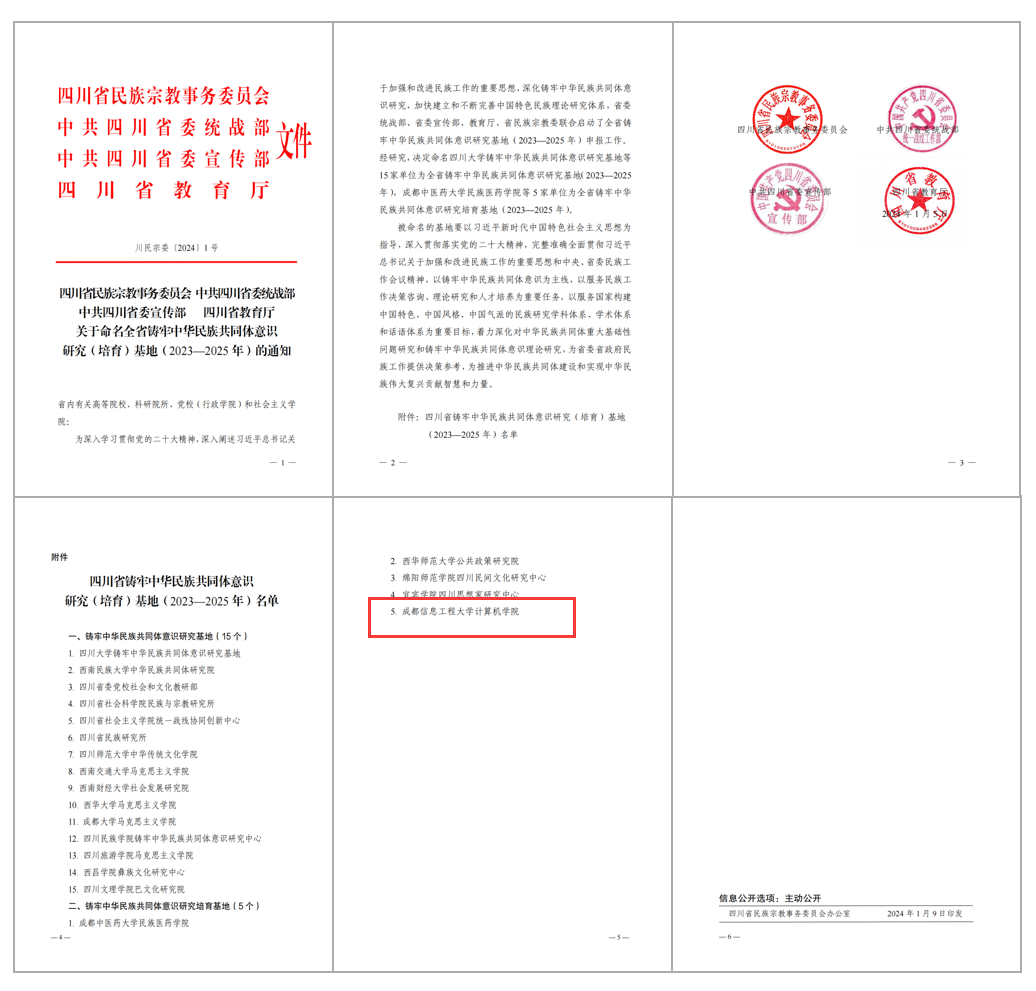 【本网讯】为贯彻落实习近平总书记在中央政治局第九次集体学习时的重要讲话精神,夯实铸牢中华民族共同体意识的理论基础,四川省委统战部、省委宣传部、省教育厅、省民族宗教委日前联合印发《关于命名全省铸牢中华民族共同体意识研究(培育)基地(2023—2025年)的通知》,决定命名全省首批铸牢中华民族共同体意识研究(培育)基地,九州(中国)计算机学院被命名为四川省铸牢中华民族共同体意识研究培训基地,位列首批基地之一,是本次被命名单位中唯一一个技术型基地。