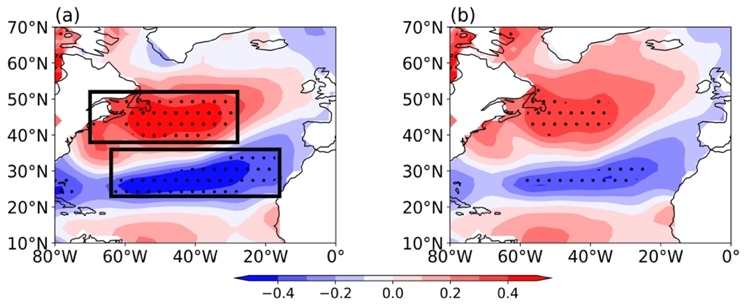 【本网讯】北大西洋海温年际变率通常可表现为三极子和马蹄形两类,其异常可对区域和大尺度天气和气候造成重要影响。大气遥相关作为大气环流基本形式之一,在调制北大西洋海温模态过程中起着至关重要的作用。亚洲—太平洋涛动作为存在于亚洲大陆和北太平洋对流层中高层的扰动温度的纬向遥相关现象,其异常可对包括ENSO现象在内的全球海温年际变率产生深远影响。但目前对北大西洋海温的年际变化是否受到APO的影响知之甚少,二者之间在年际尺度上是否存在联系,如存在,联系背后的潜在物理过程是什么?