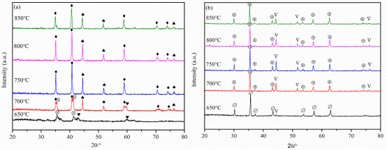 图3载氧体反应后的晶相(a)NiMn2O4(b)NiFe2O4