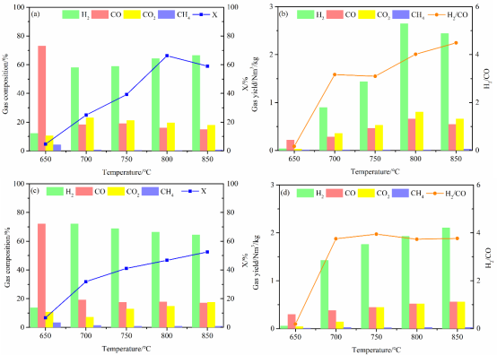 图4不同反应温度条件的气体组成(a) NiMn2O4(b) NiFe2O4