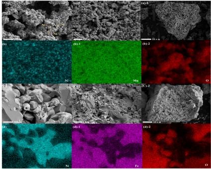 图1反应前载氧体表面结构和元素分布(a) NiMn2O4(b) NiFe2O4