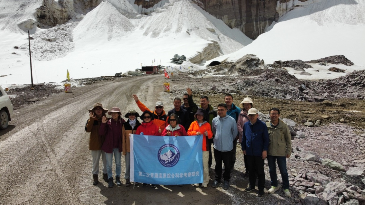 科考队员在海拔4975米康西瓦隧道冰川前合影留念