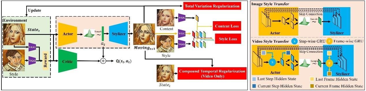 该论文在国际上首次提出基于深度强化学习的风格迁移框架,该框架将单步风格迁移拆分为逐步风格迁移的过程。本文的方法倾向于在早期步骤中预先提供更多内容的细节和结构信息,并在后期步骤中合成更多风格的模式。此外,本文基于强化学习的模型比现有的基于单步深度学习的模型更轻量,计算复杂度更低。实验结果证明了该方法的有效性和鲁棒性。