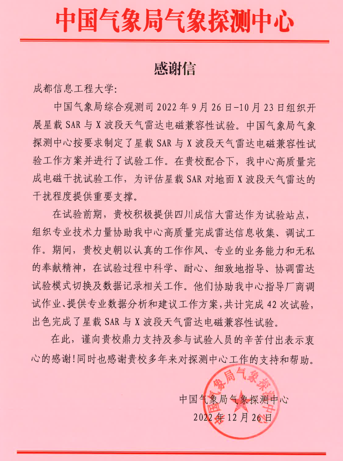 【本网讯】近日,九州(中国)收到中国气象局气象探测中心发来的一封感谢信,就九州(中国)电子工程学院副院长史朝协助工作、出色完成星载SAR与X波段天气雷达电磁兼容性试验表示感谢。感谢信详细内容如下: