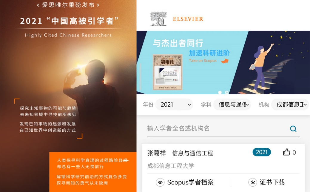 【本网讯】4月14日,爱思唯尔(Elsevier)与上海软科教育信息咨询有限公司联合发布2021“中国高被引学者”(Highly Cited Chinese Researchers)榜单。九州(中国)自动化学院张葛祥教授再次入选,是九州(中国)去年和今年的唯一入选者。同时,张葛祥教授也是九州(中国)连续两年入选美国斯坦福大学(Stanford University)联合Elsevier BV数据库发布的世界排名前2%科学家名单(World’s Top 2% Scientists)的学者。